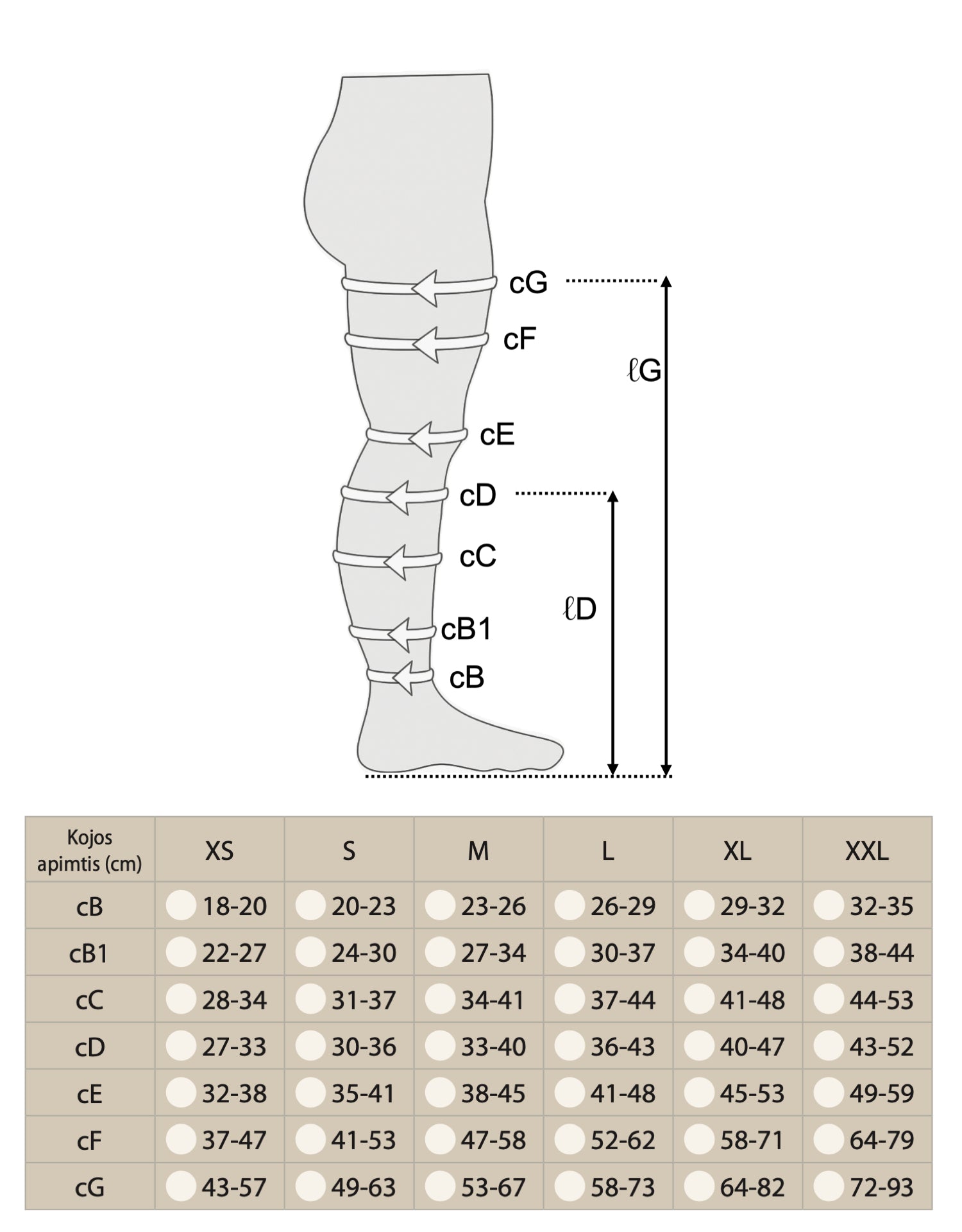 Kitos lentelėje pateiktos matavimų reikšmės padeda įsitikinti, ar išsirinktas dydis teisingas – patikrinkite, ar jie atitinka. Kojines rinkitės tokias, kurių visi matmenys atitinka, nes naudoti saugu tik tokį dydį, kurio visi matmenys atitinka lentelėje nurodytus.